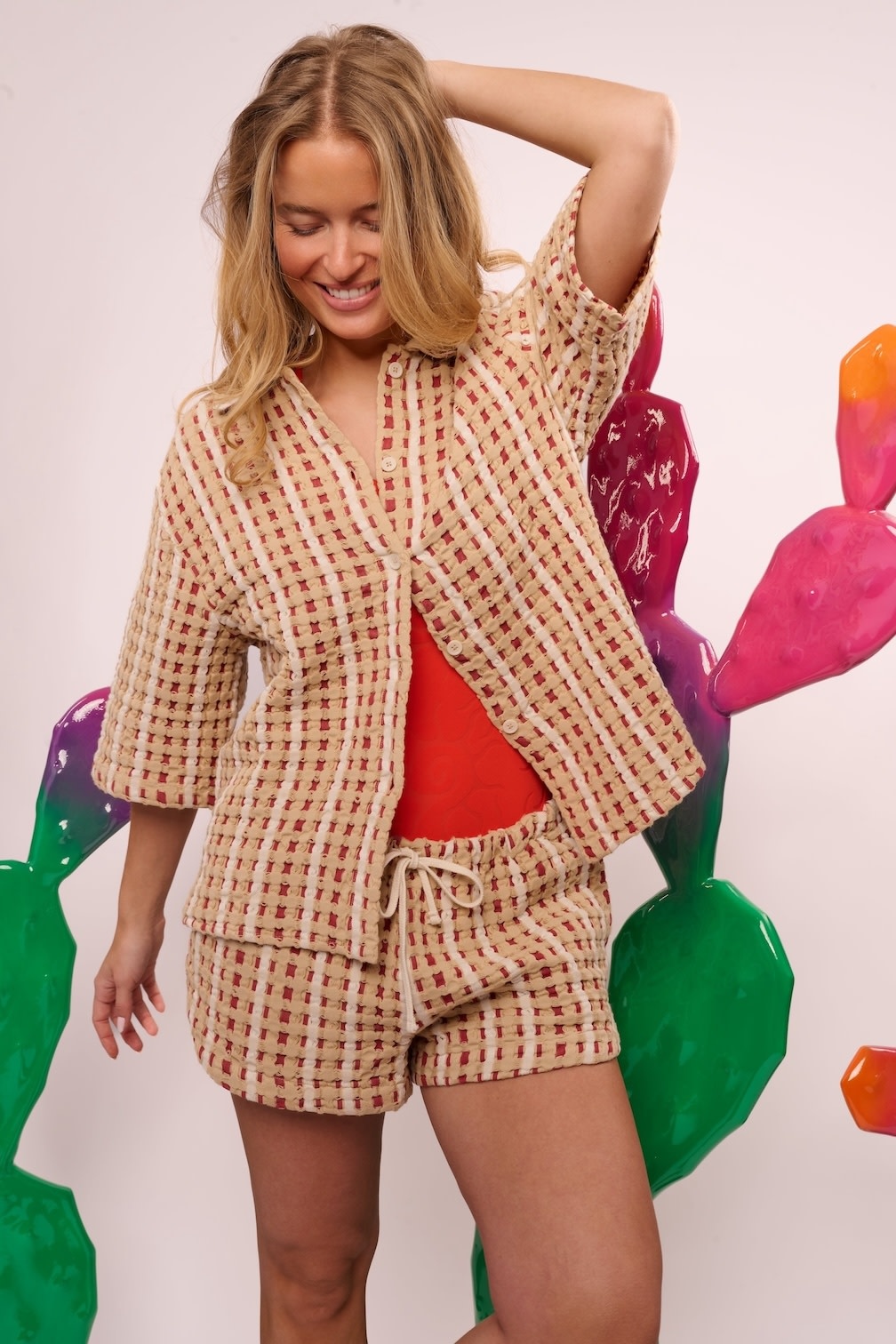This waffle shirt with red and beige check pattern by OAS, is ideal to wear on the beach. It has a relaxed silhouette with dropped shoulders and wide sleeves.
