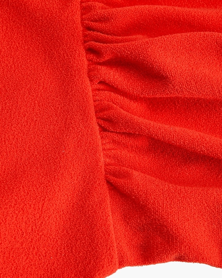 This bright red-orange one-shoulder swimsuit by OAS is designed with ruched detailing along the shoulder and side. Fully lined with concealed seams.