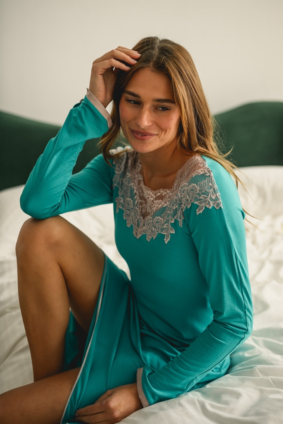 Experience the pleasure of the flowing fabric of this Paladini nightdress. Finished with beautiful lace at the neckline and featuring a flattering length that falls just above the knee.