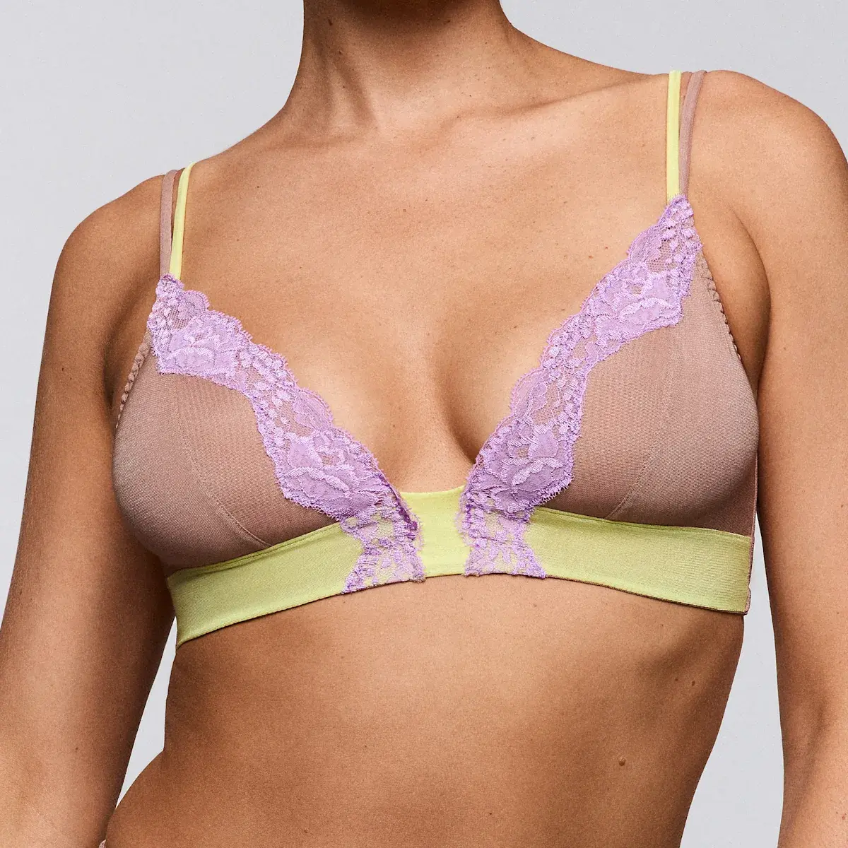 This Sarda bralette without underwire offers the perfect combination of a subtle skin-colour and vibrant colour contrasts. The design creates a plunging neckline, allowing you to wear it under low-cut clothing.