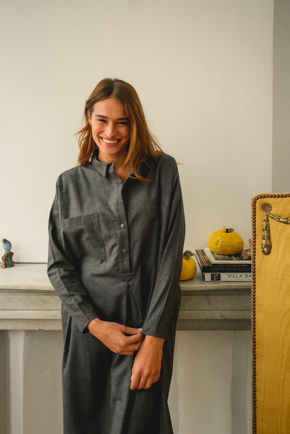 Partly buttoned, with a classic collar and two large chest pockets, Lorraine by Sunday In Bed is a favourite for anyone who loves a loose and casual look. With a flattering knee length.