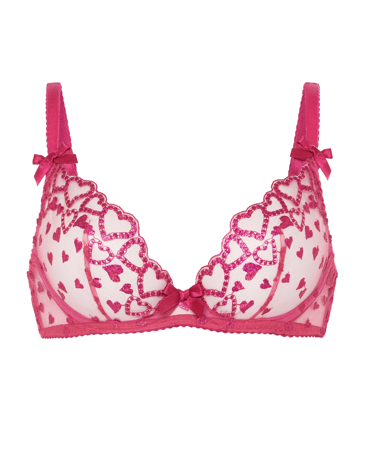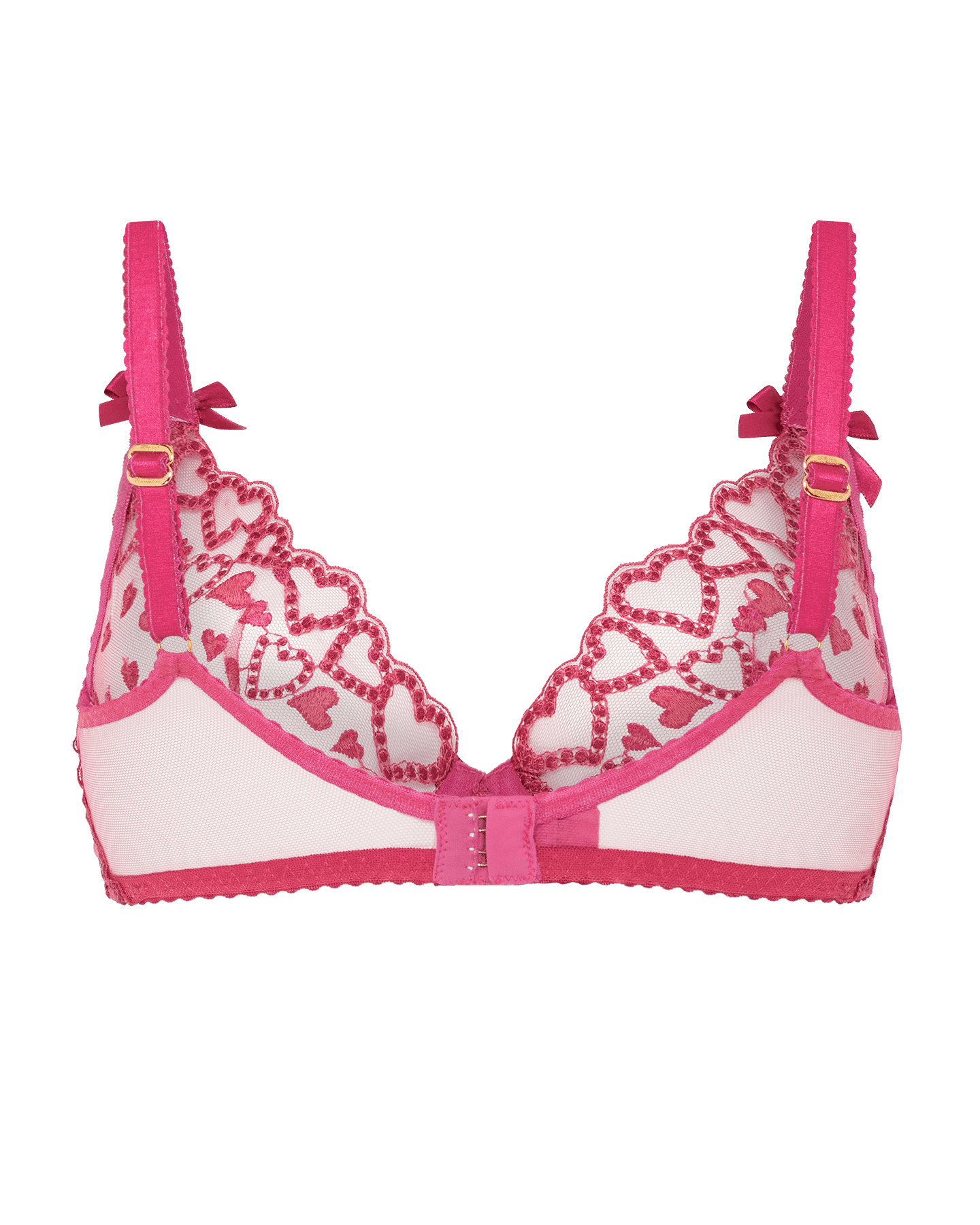 Deze plunge-bh van Agent Provocateur is ontworpen om de borst te liften en te accentueren met speelse, hartvormige borduursels op tule cups. Verstelbare, elastische bandjes met een geschulpte rand zorgen voor een perfecte pasvorm. Afgewerkt met satijnen strikjes, baleinen aan de zijkant en elastische details voor de kenmerkende AP-uitstraling.