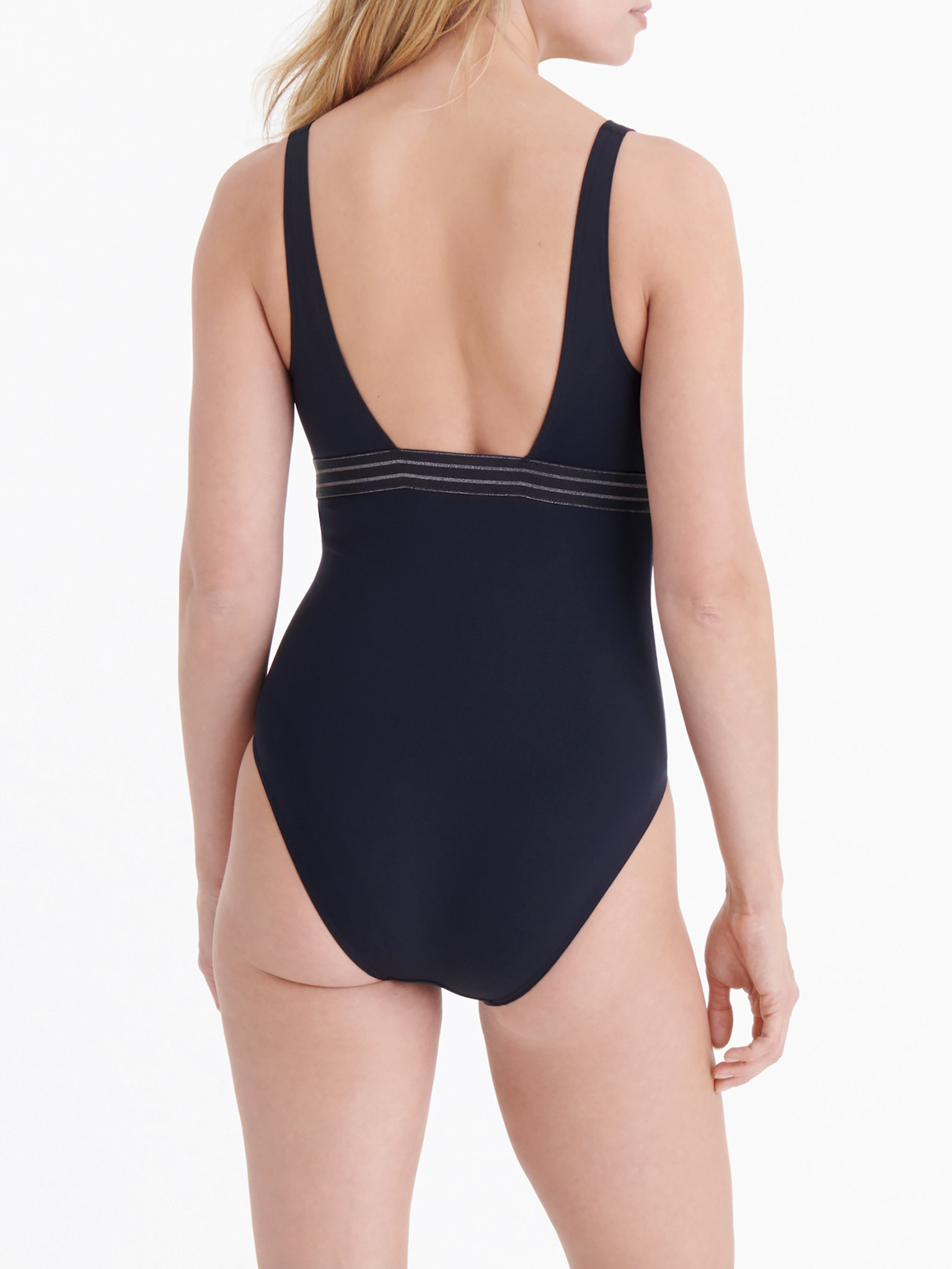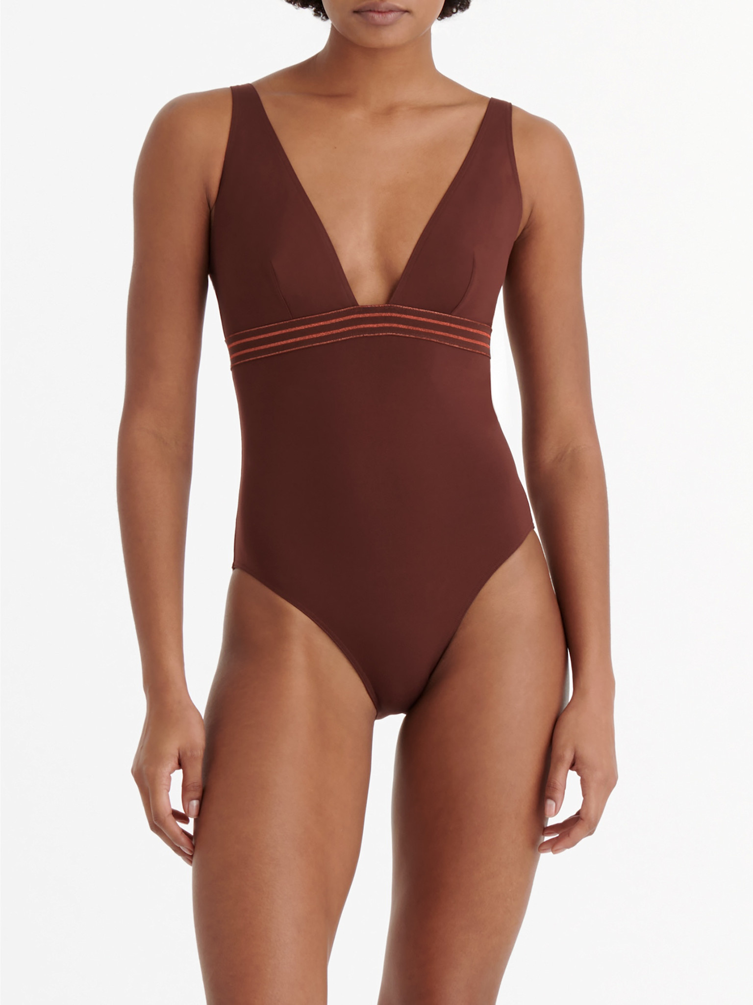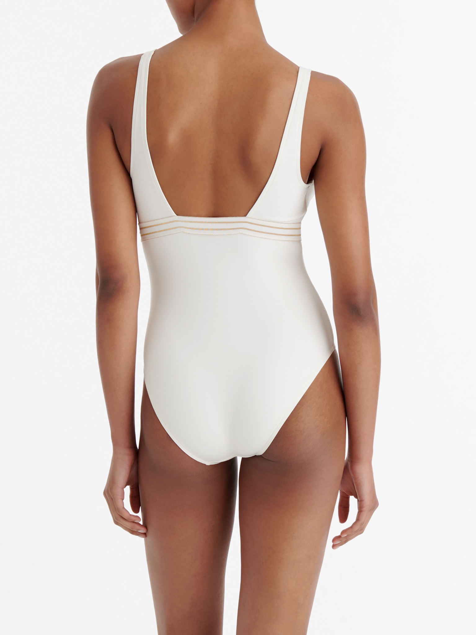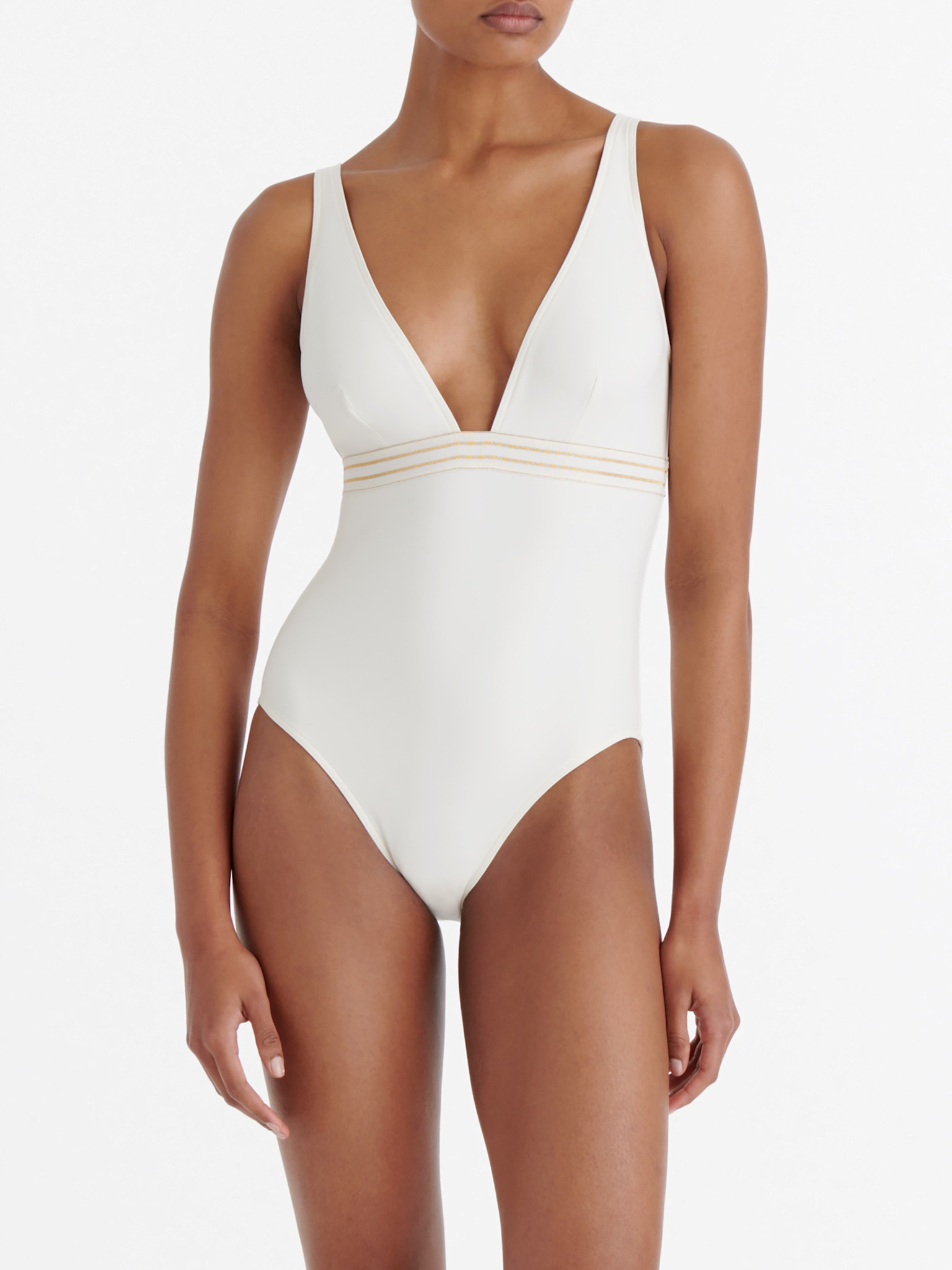Eenvoud en vrouwelijkheid gaan samen in het Sillage badpak van Eres met een elegante V-hals en een glanzende naad onder de buste, versierd met elastische lurex grosgrain.