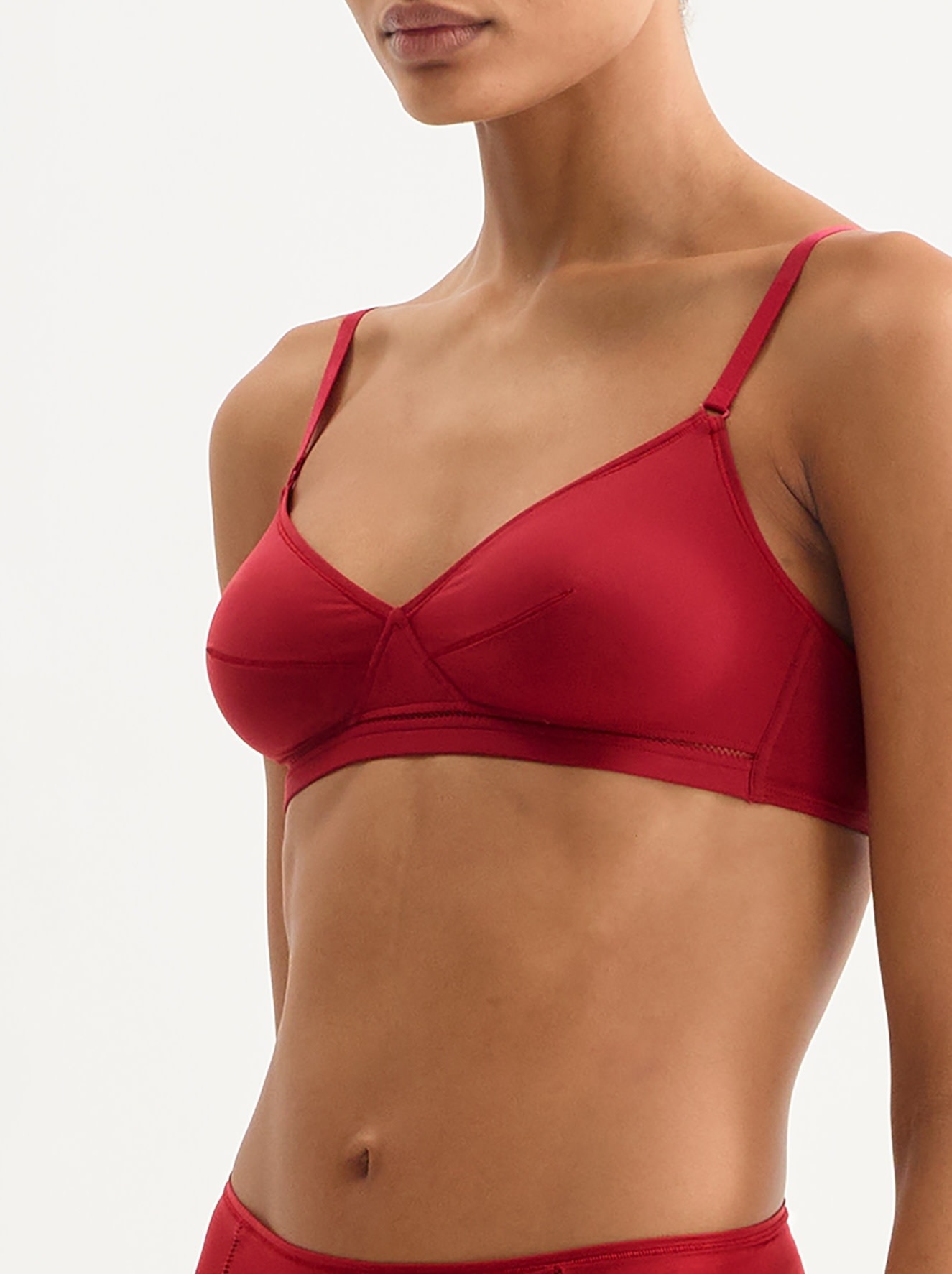 Stijl en minimalisme komen samen in deze beugelloze triangelbeha van Eres. In een innovatief materiaal van gerecycled polyamidegaren biedt het comfort en bewegingsvrijheid.
