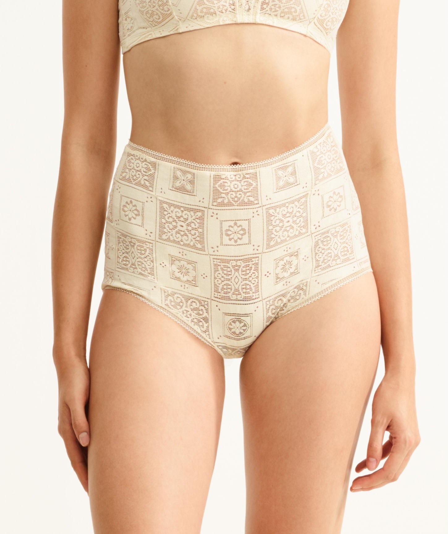 De Symbolique slip met hoge taille van Eres is versierd met een geometrisch motief dat een licht- en schaduweffect creëert. De slip is gemaakt van elastisch jacquardkant, wat zorgt voor een gedurfde en vrouwelijke stijl.