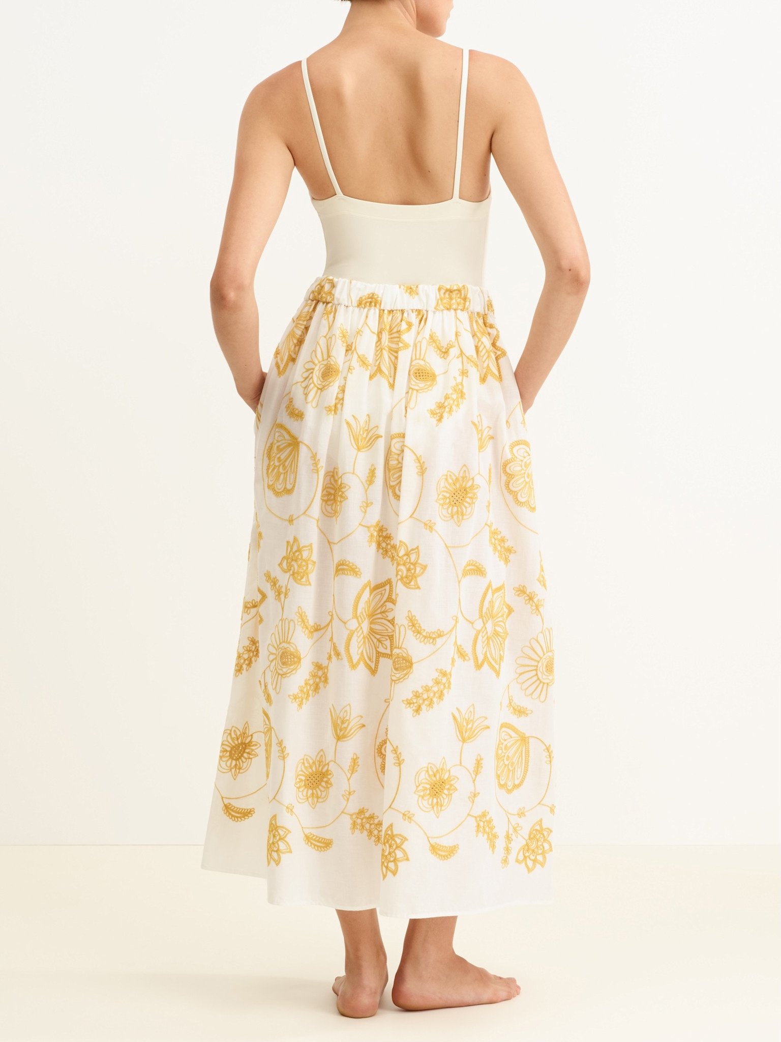 Calie van Eres is een lange, geborduurde katoenen rok met een elastische taille en een luchtige, zwierige vorm. De bloemenborduursels en boho-charme maken het een essentieel kledingstuk voor het creëren van elegante en ontspannen looks.