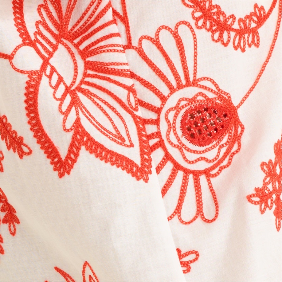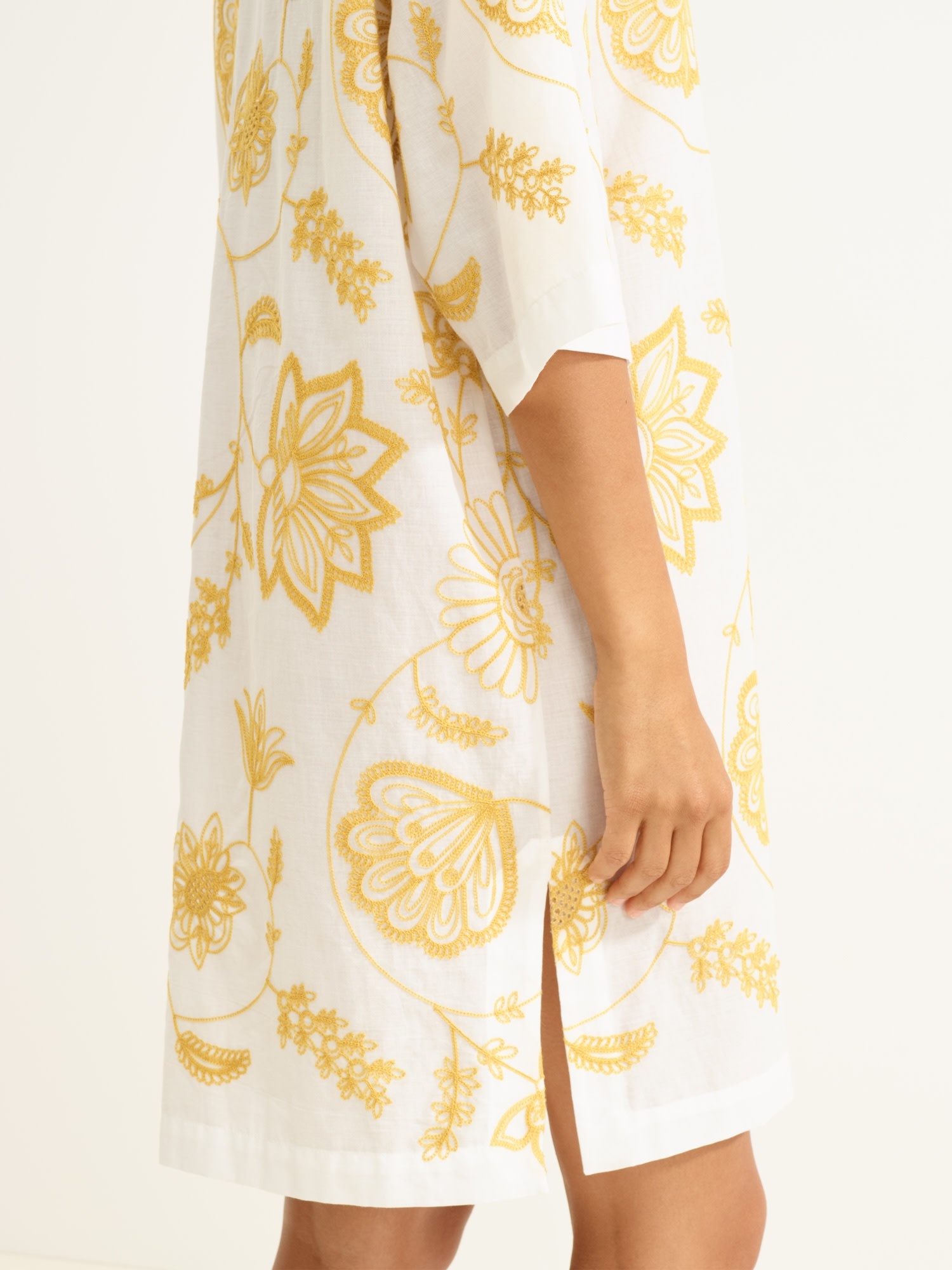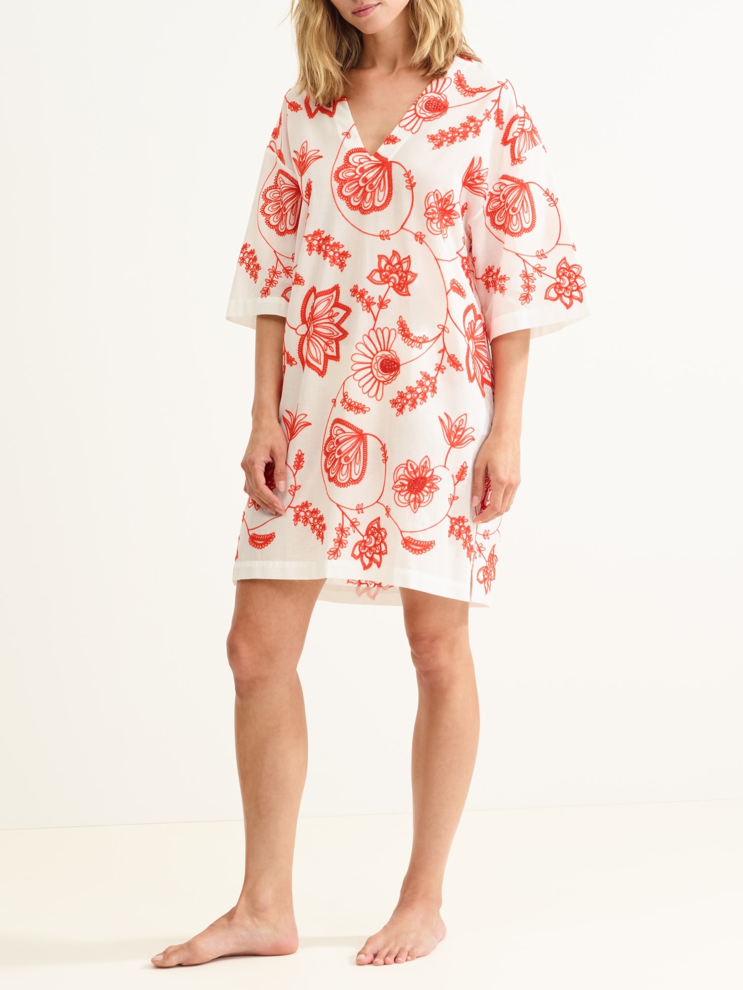 Levia van Eres is een korte, geborduurde katoenen jurk met een V-hals en driekwartmouwen. De contrasterende borduursels en de zwierige pasvorm geven de jurk een delicate uitstraling, perfect om zo te dragen of te combineren met accessoires.
