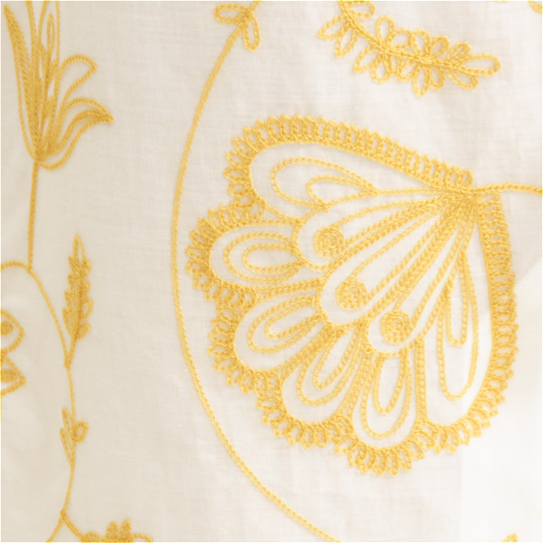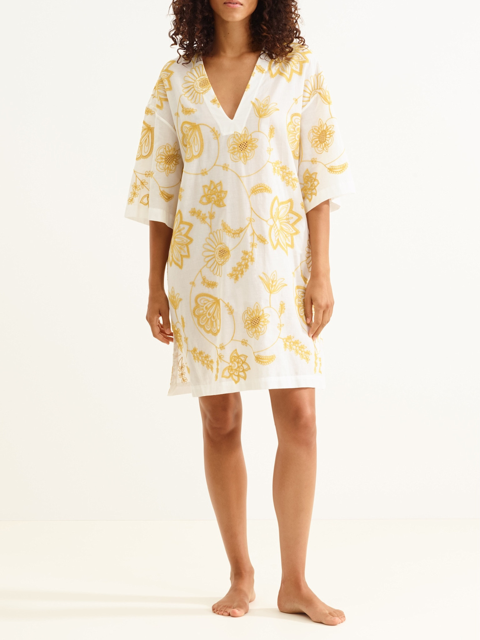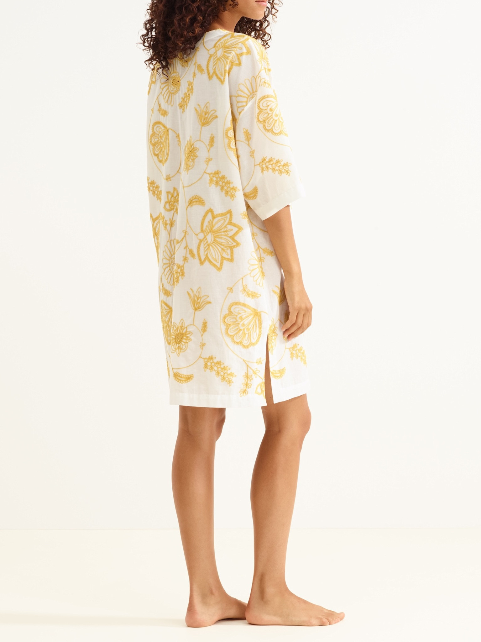 Levia van Eres is een korte, geborduurde katoenen jurk met een V-hals en driekwartmouwen. De contrasterende borduursels en de zwierige pasvorm geven de jurk een delicate uitstraling, perfect om zo te dragen of te combineren met accessoires.