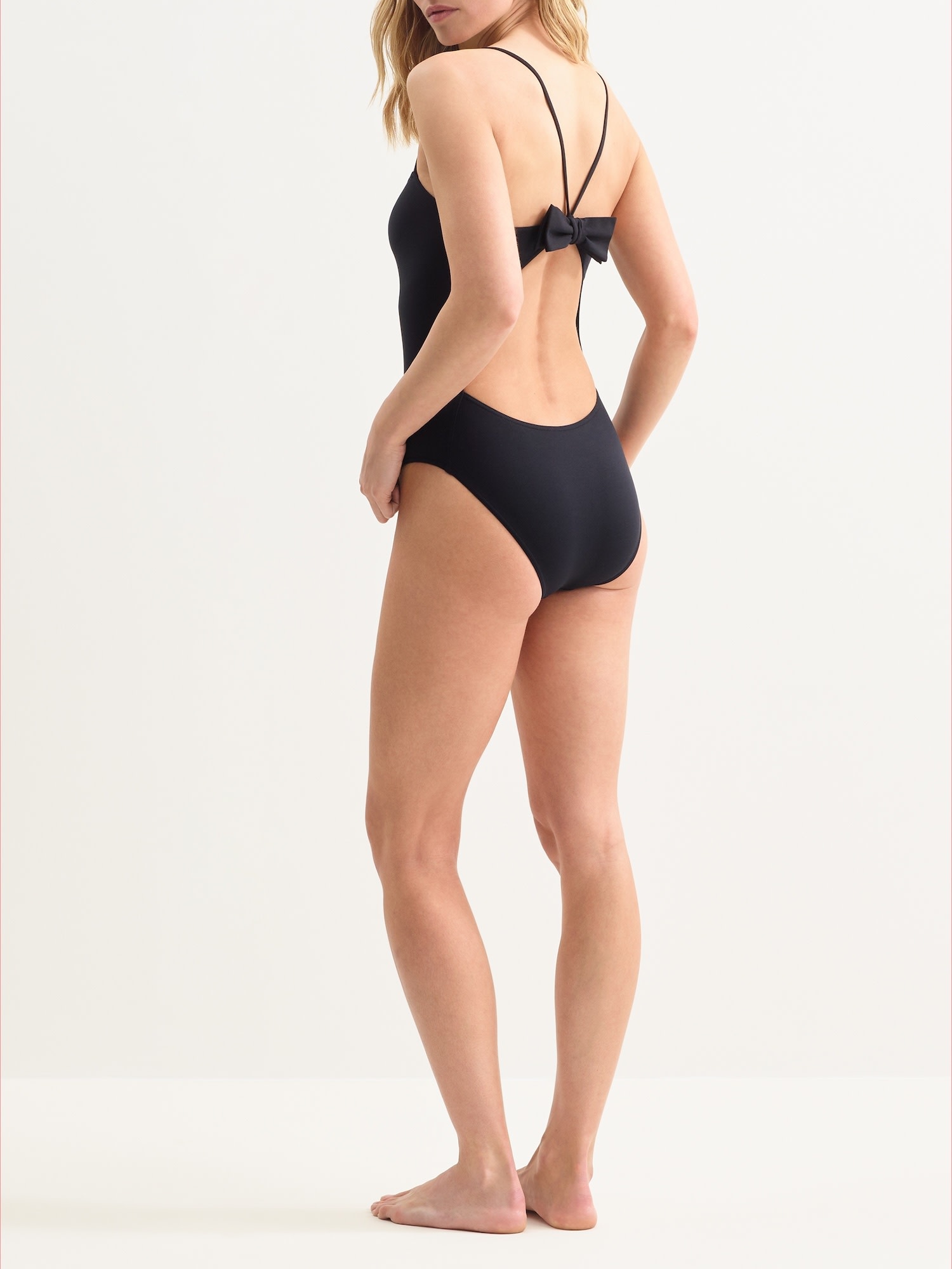 Dit badpak uit de Smoking Couture-lijn van Eres roept de charme van de jaren 70 op. Het ingetogen silhouet verbergt een elegante en opvallende rug met delicate gekruiste bandjes en een strik in het midden.
