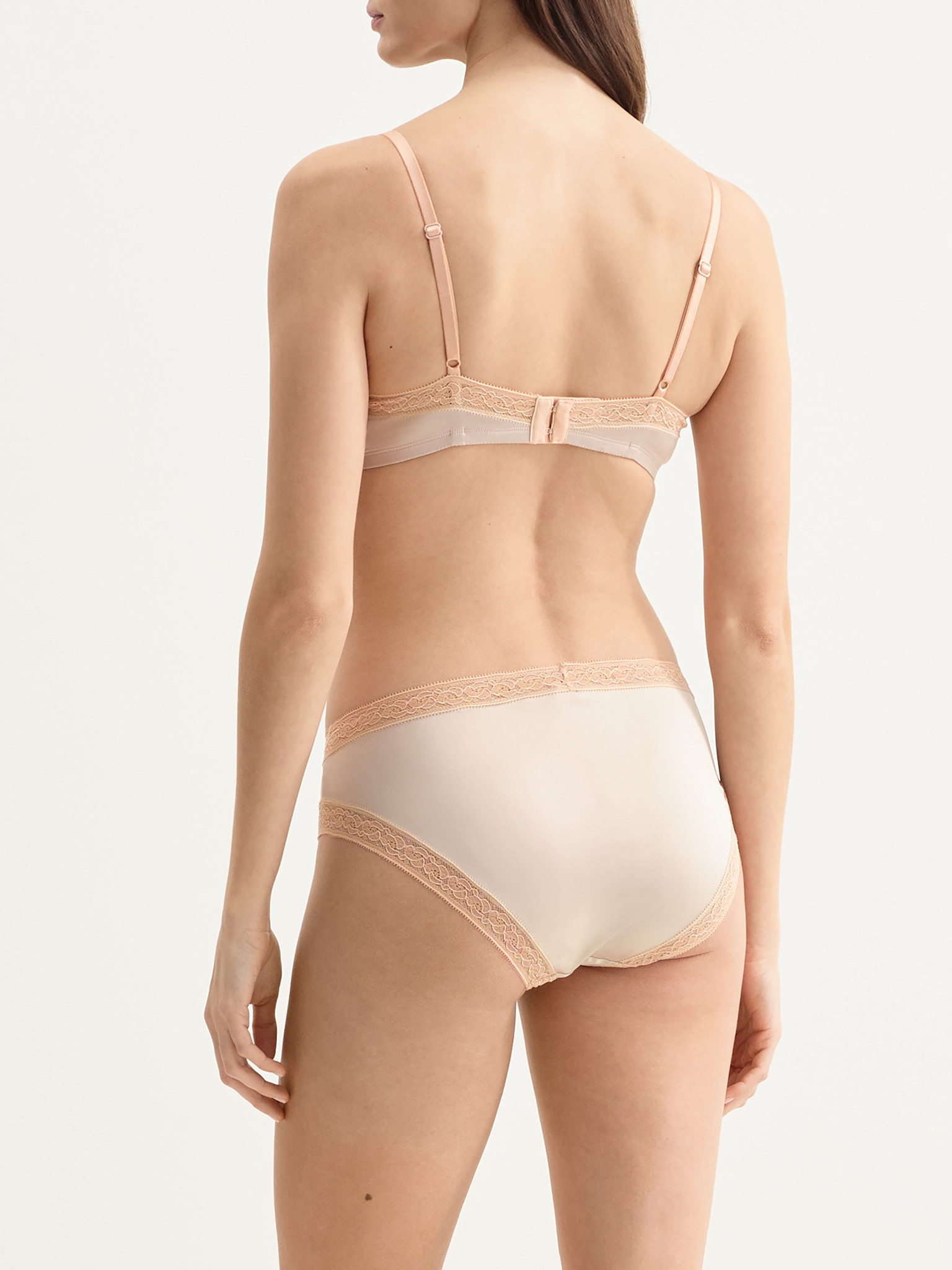 De Destin Bralette van Eres belichaamt de kenmerkende codes van het merk, waaronder een driehoekige brug tussen de cups en zijden satijn met kant voor de perfecte combinatie van comfort en vrouwelijkheid.