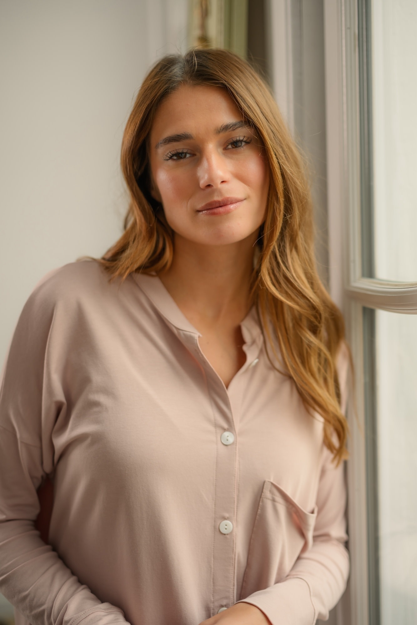 Van boven tot onder dichtgeknoopt, met een kleine opstaande kraag en een grote borstzak; Gerdi van Sunday In Bed is de favoriet van iedereen die van los en casual houdt. Maar ook aanstaande en jonge moeders zijn er dol op.